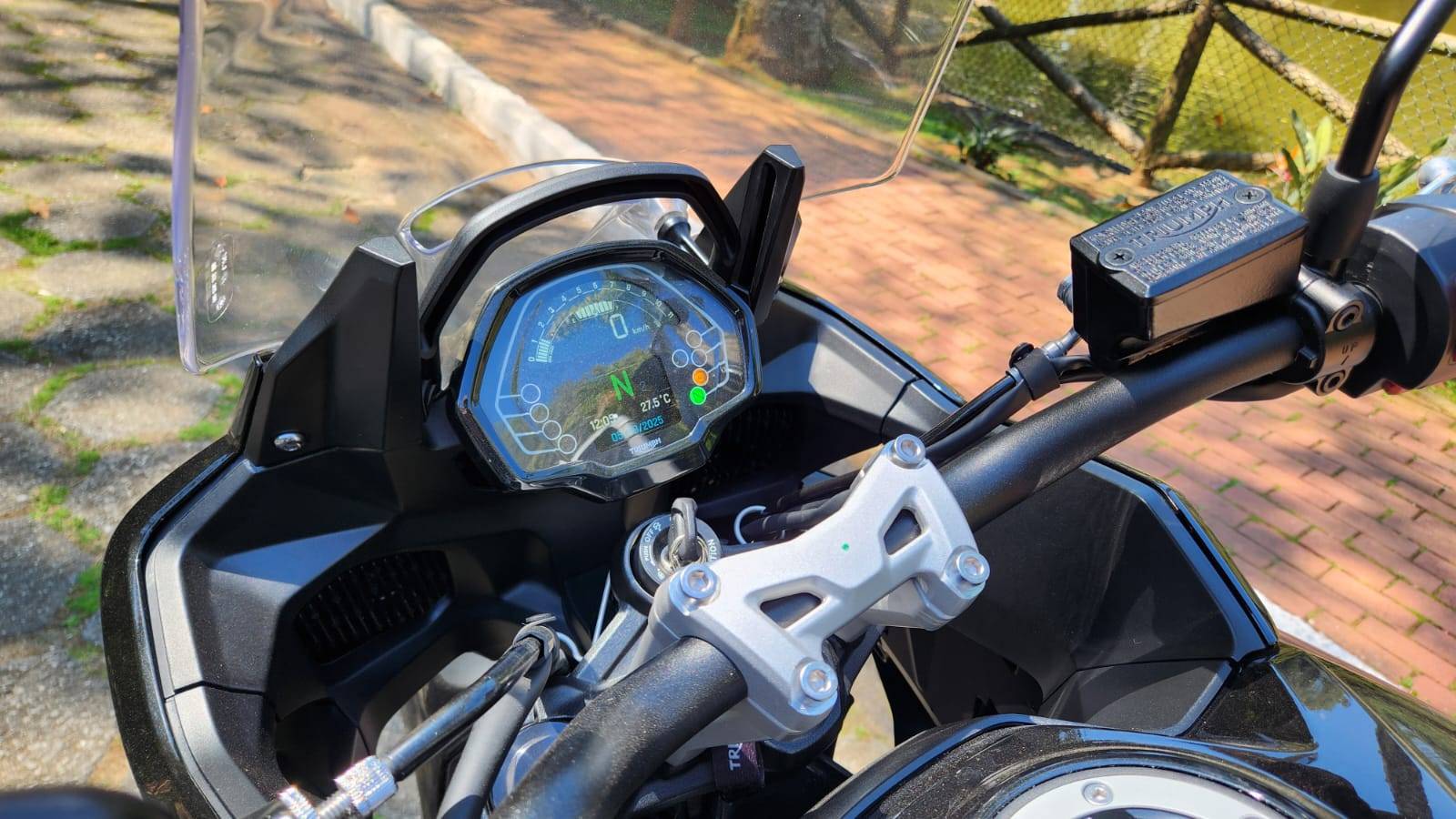 A ergonomia é um ponto que merece destaque. O assento está a 835 mm do solo e, aliado ao guidão largo e à posição ereta de pilotagem, transmite controle ao condutor. Esse conjunto se mostrou adequado tanto no deslocamento urbano quanto em percursos de maior extensão. O banco, por sua vez, é firme: garante apoio adequado, mas tende a gerar cansaço em jornadas mais extensas.O painel TFT colorido, com ótima leitura, oferece integração simples e funcional com smartphone. A navegação pelos menus é intuitiva, permitindo ao piloto acessar informações essenciais sem distrações. Outro recurso relevante é o controle de tração comutável, que, junto aos modos de pilotagem Road e Rain, amplia a segurança em condições diversas de piso.