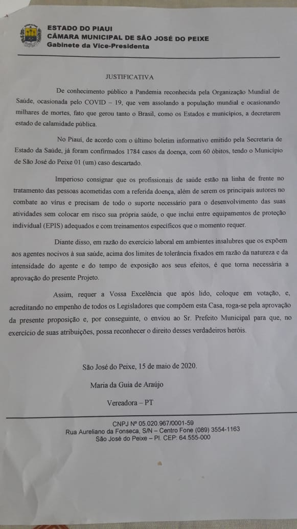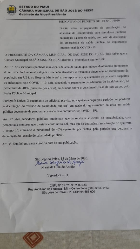 A vereadora Daguia do PT entrou com um indicativo de Projeto de Lei para a Prefeitura de São José do Peixe pagar uma remuneração aos servidores da saúde que estão trabalhando na linha de frente da Covid-19. A vereadora apresentou seu indicativo de projeto de lei na sessão do dia 15 de maio para ser votado na seção do dia 22 de mai.