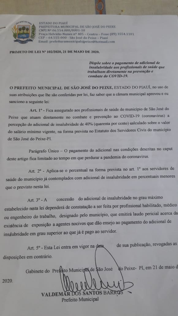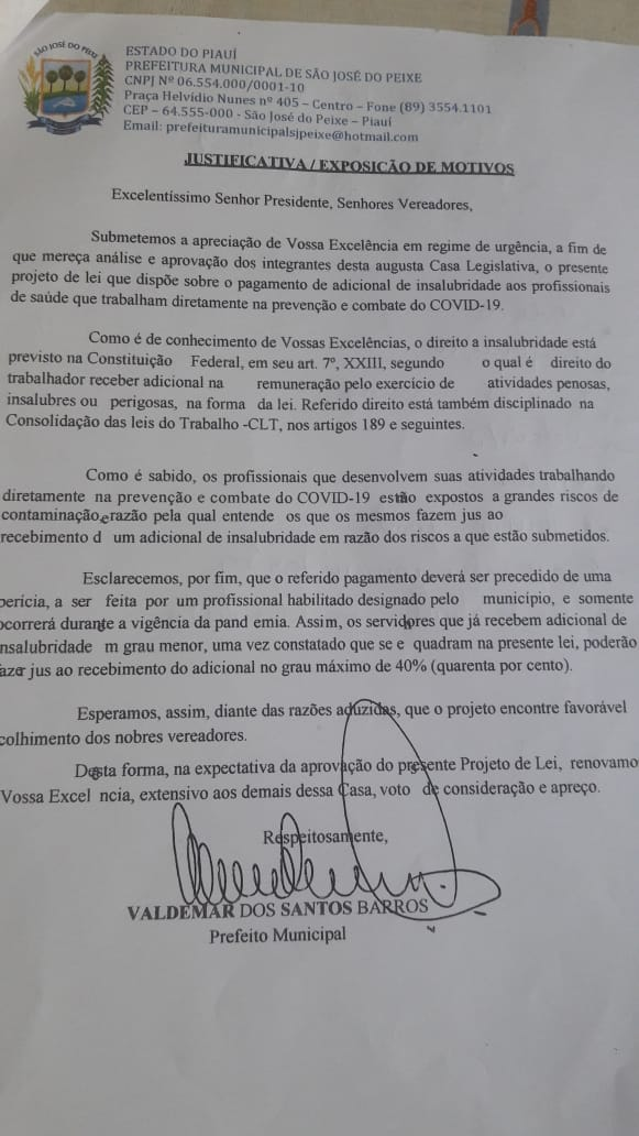 Projeto de Lei do prefeito Valdemar dos Santos Barros: