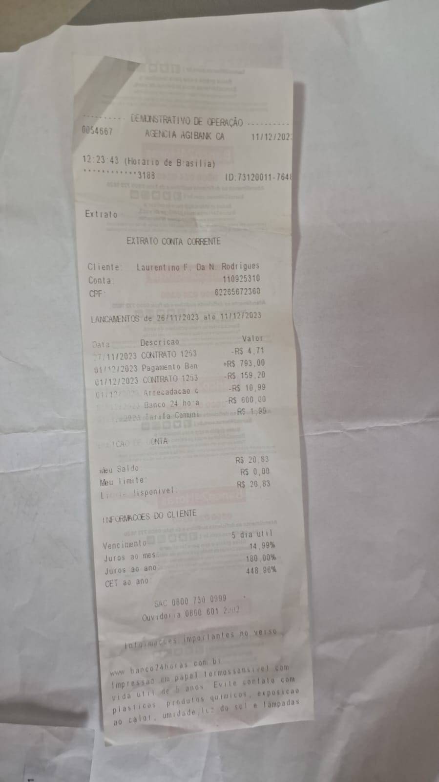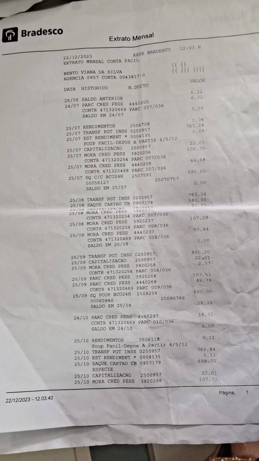 Raimundo Ferreira da Silva recebe R$ 841 do INSS, porém, com os descontos não autorizados do Agibank fica com apenas R$ 590. “Faz tempo que isso acontece, quando vou ao mercado não sobra nada”, disse.