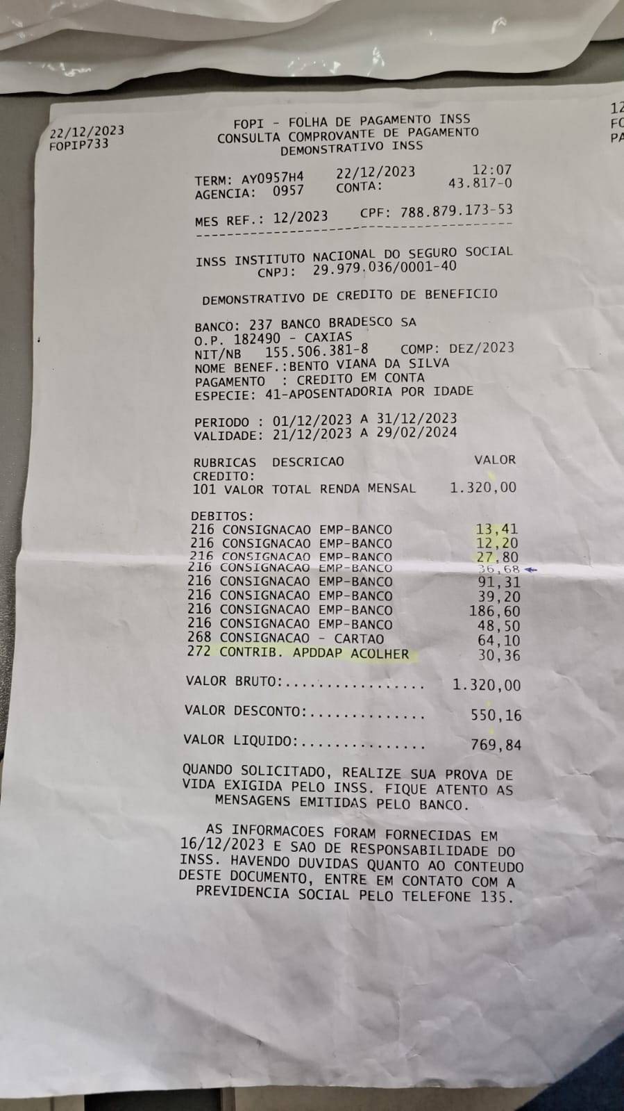 Antônia se informou e descobriu que outros vizinhos em São João do Sóter também passavam pelo mesmo problema. Um exemplo é o senhor Bento Viana da Silva. No contracheque dele, a renda mensal é de R$ 1.320, porém, ele fez consignado que desconta R$ 550,16, assim, era para ele receber um valor líquido de R$ 769,84, porém, recebe muito menos, apenas R$ 580, devido aos descontos bancários que incluem até mesmo título de capitalização.