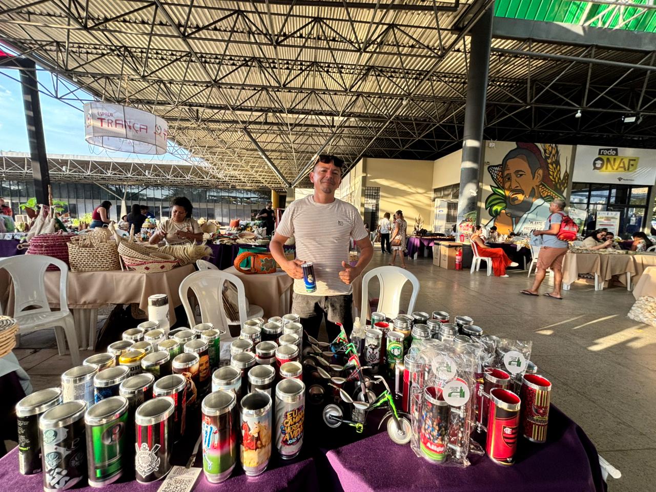 Levando ao pé da letra a ideia sustentável do evento, Elício de Sousa, de 43 anos, levou para a feira um trabalho transformador: canecas ecológicas e itens decorativos, feitos a partir de latas de refrigerante recicladas. “Eu sou cabeleireiro, mas sempre gostei de arte.  Conheci a reciclagem e isso me despertou a curiosidade de aprender e produzir. Fui fazendo, as pessoas foram gostando, comprando e hoje é o que faço para complementar a renda e está dando certo”, disse o artista.
