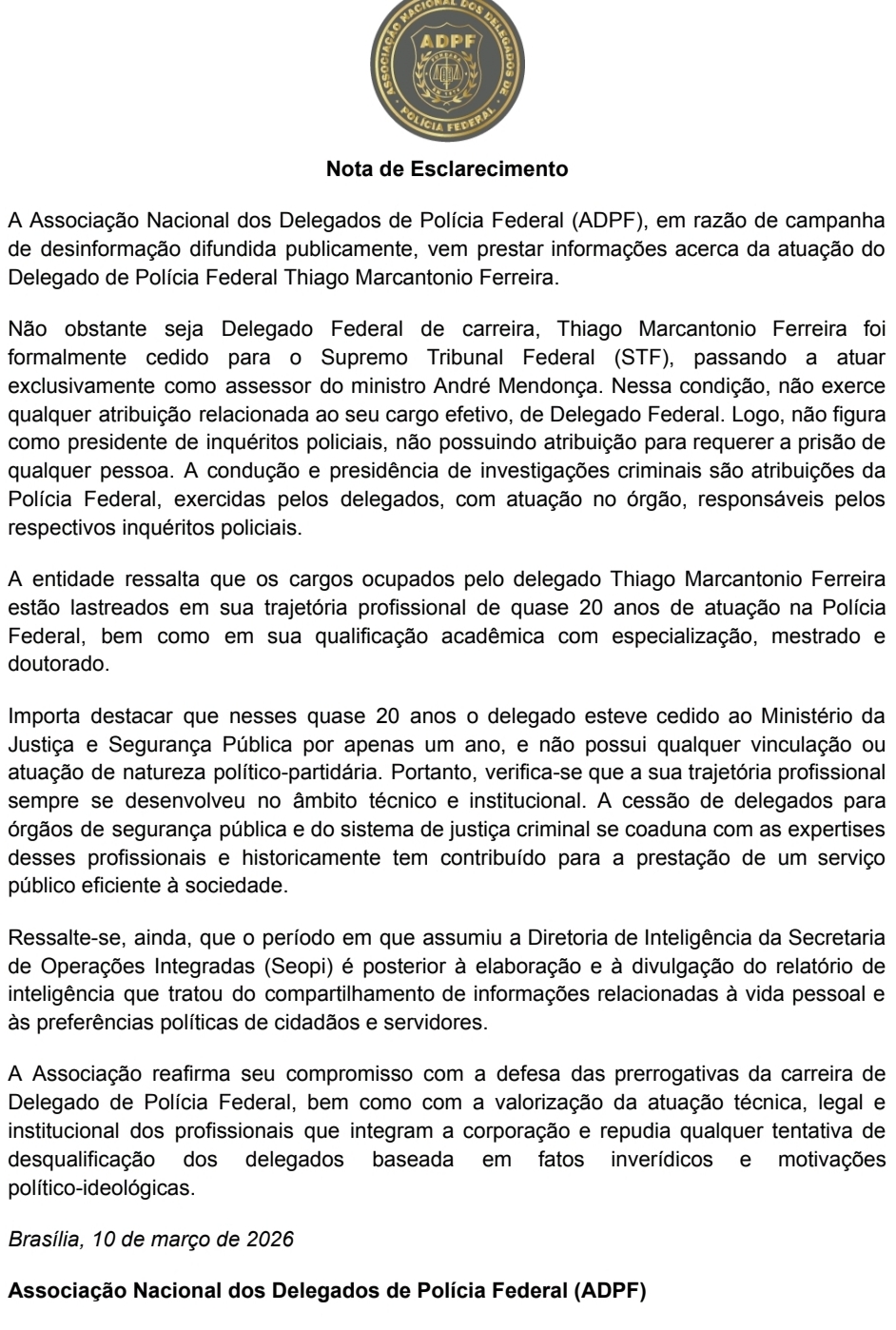 A Associação Nacional dos Delegados da Polícia Federal, lançou uma nota de apoio ao delegado. O documento explica que ele não preside inquérito e que sempre agiu de forma técnica e dentro da lei. Leia a seguir a nota da ADPF: