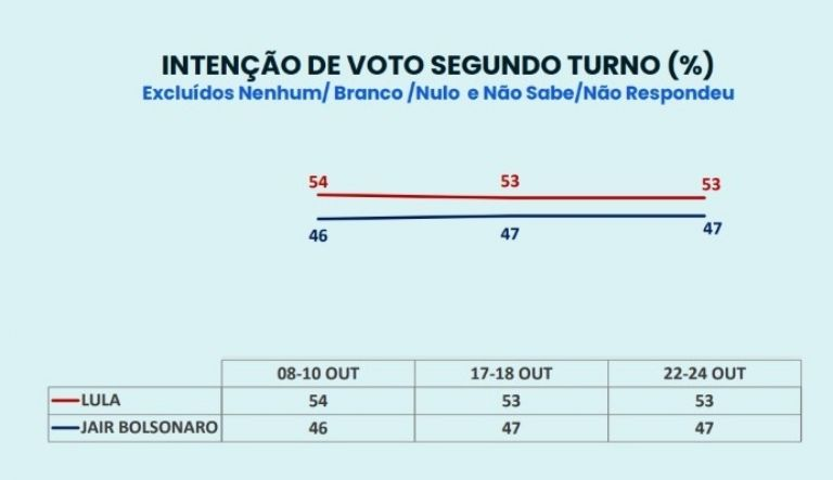 O índice é idêntico ao divulgado pelo instituto na semana passada e também dos dados divulgados pela AtlasIntel nesta segunda-feira (24)