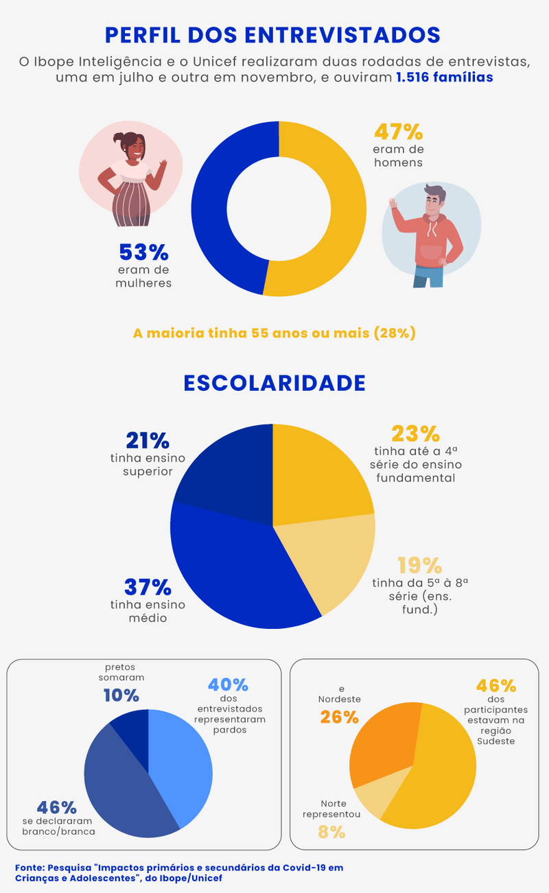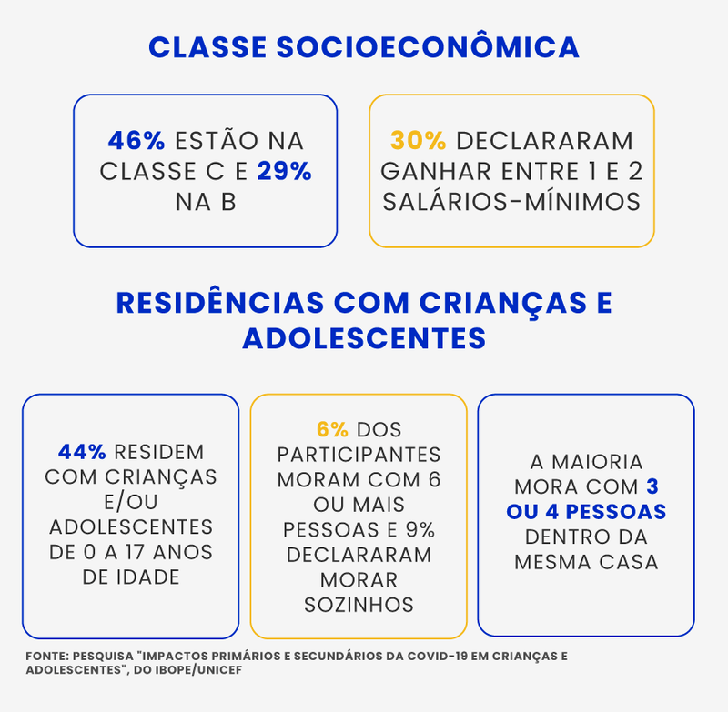 A mesma pesquisa do UNICEF apresenta dados sobre como a renda familiar caiu durante a pandemia. Nesse sentido, cerca de 86 milhões de brasileiros afirmaram que o rendimento de seus domicílios diminuiu desde o início da crise causada pelo avanço da Covid-19. Dos entrevistados no levantamento, 30% disseram que não estavam trabalhando antes da pandemia e continuam sem ocupação, e 14% estavam com emprego, mas atualmente estão desempregados.