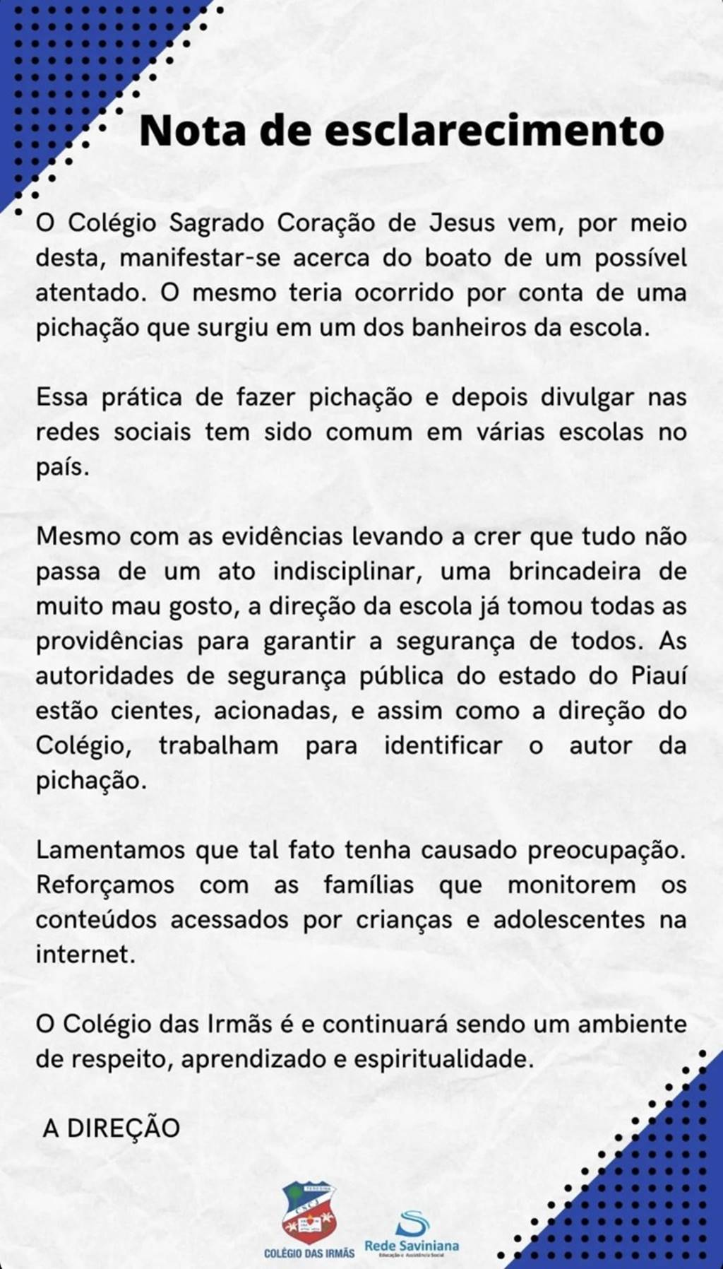 Em nota, o colégio informou que a suposta ameaça surgiu por meio de uma pichação em um dos banheiros da escola e posteriormente divulgada nas redes sociais. A escola enfatizou que essa prática vem ocorrendo em várias escolas do país e que tudo não passa de um ato indisciplinar, uma brincadeira de muito mau gosto.