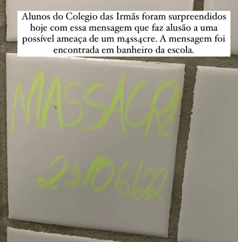 Uma ameaça de um massacre no Colégio Sagrado Coração de Jesus, mais conhecido como Colégio das Irmãs, na avenida Frei Serafim, em Teresina, assustou alunos, pais e professores nessa quarta-feira (22). A ameaça foi escrita nos azulejos da parede de um banheiro da escola e informava que o crime iria acontecer nesta quinta-feira (23).