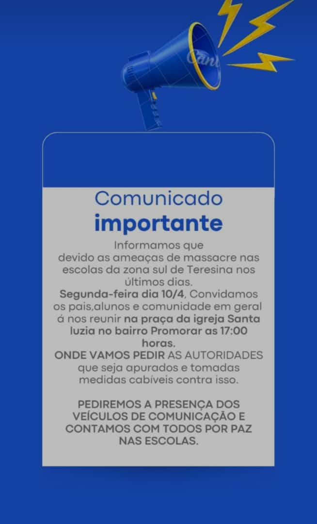 A polícia informou que não há nenhuma ameaça oficial de massacre nas escolas de Teresina e que os suspeitos de disseminar o conteúdo já estão sendo investigados.