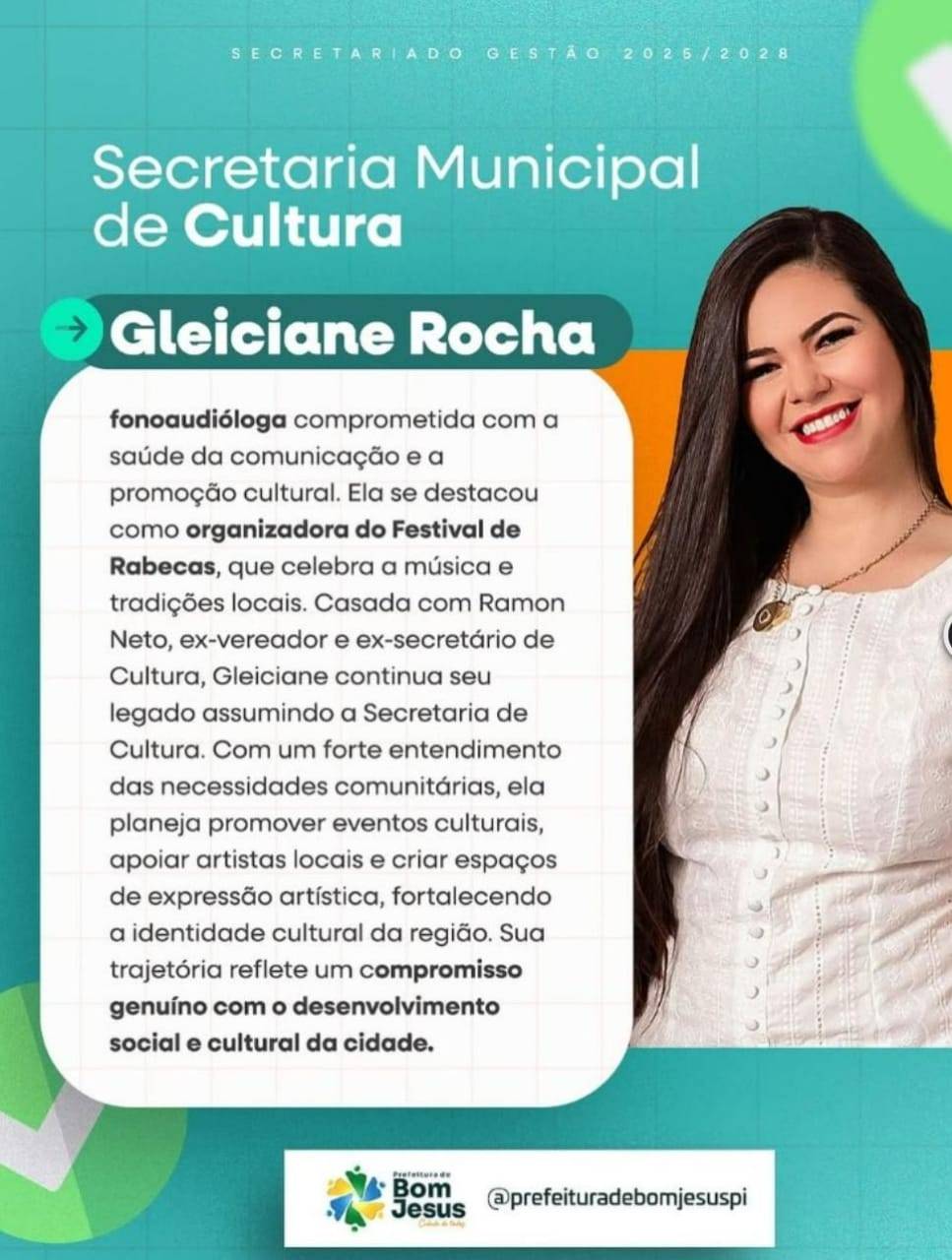 A suplente de Vereadora, fonoaudióloga, Gleiciane Rocha, é a nova titular da pasta de Cultura do município de Bom Jesus-PI. Ela é produtora cultural e já se destacou na organização de eventos culturais no município, como por exemplo a última edição do Festival de Rabecas, um dos maiores símbolos da identidade cultural da região.