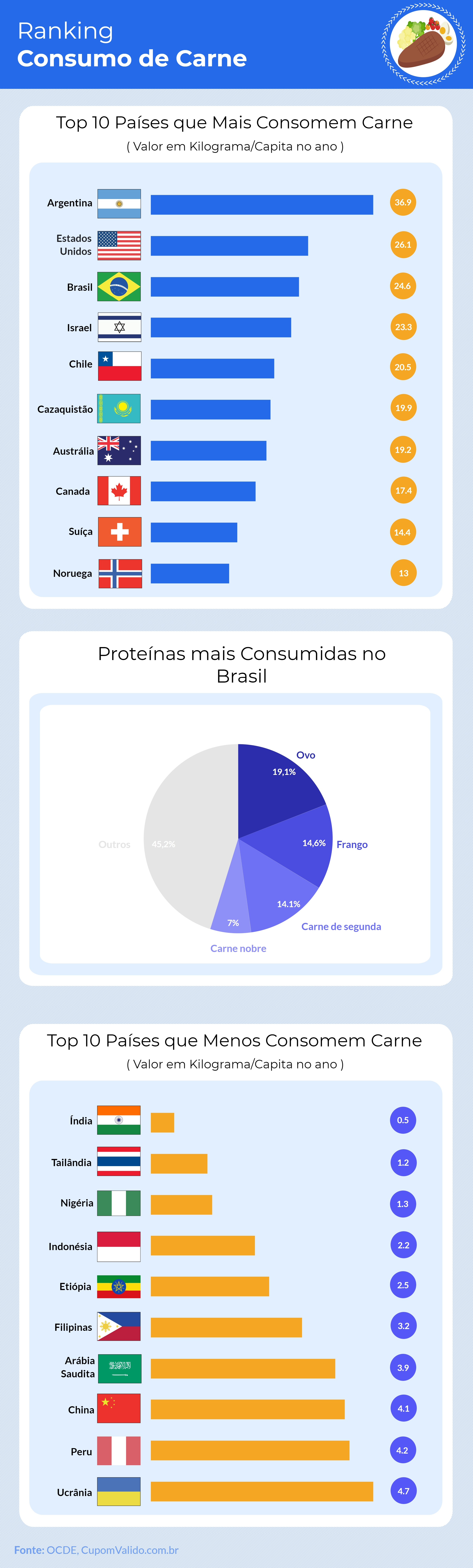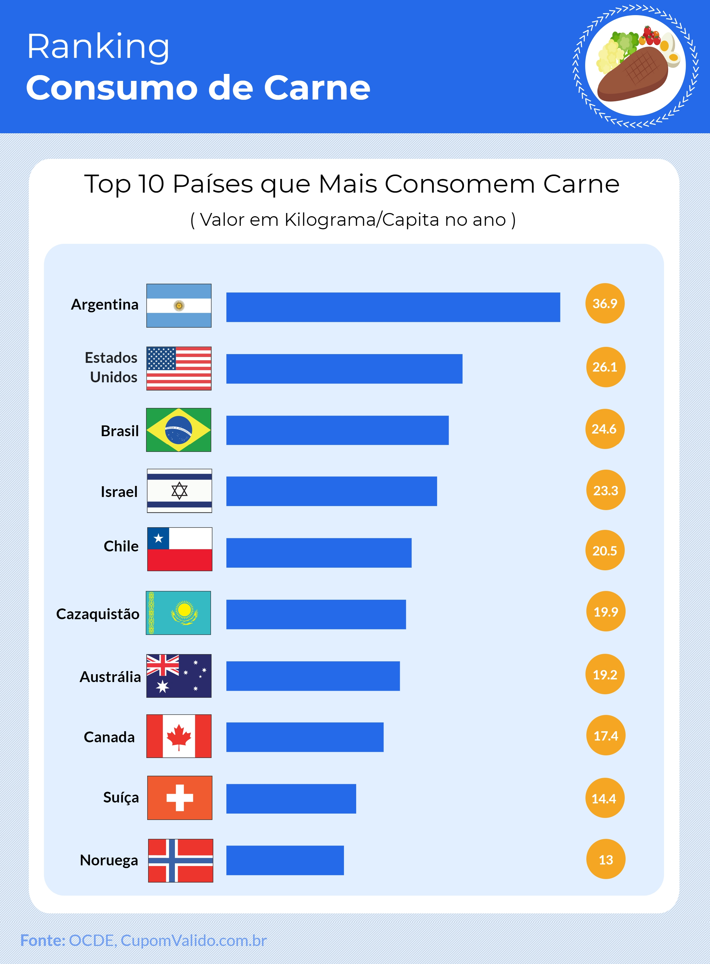 É que revela um estudo realizado pela plataforma CupomValido.com.br com a OCDE sobre o consumo de carne nos principais países.