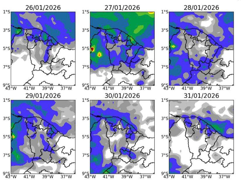 De acordo com os dados meteorológicos, há previsão de volumes significativos de chuva entre os dias 26 e 31 de janeiro, com maior intensidade concentrada nos períodos da tarde e da noite. Também são esperadas pancadas intermitentes ao longo do dia, principalmente entre segunda (26) e a terça-feira (27).