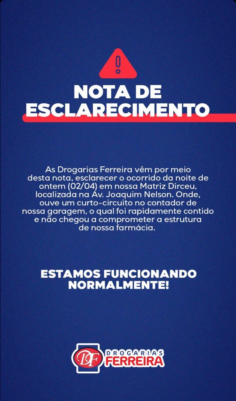 Em nota, a Drogaria Ferreira disse que houve um curto-circuito no contador de energia e que o incêndio não comprometeu a estrutura. Felizmente ninguém ficou ferido e houve apenas danos materiais. O atendimento ao público está funcionando normalmente.