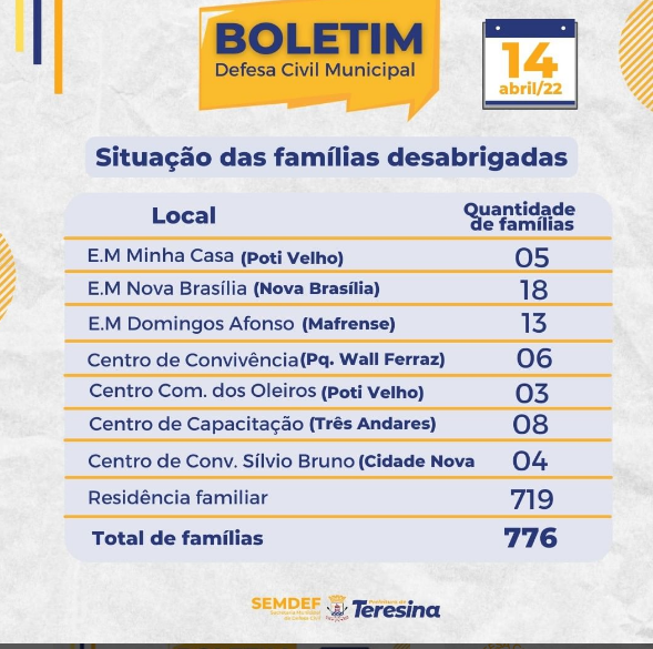 Subiu para 776 o número de famílias desabrigadas em Teresina em decorrência das fortes chuvas. A informação consta no último boletim divulgado pela Secretaria Municipal de Defesa Civil nessa quinta-feira (14).