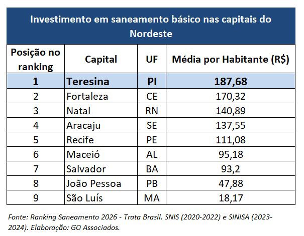 Além da evolução no ranking, a cidade também lidera os investimentos em saneamento no Nordeste. O aporte médio chegou a R$ 187,68 por habitante, e, considerando apenas 2024, o valor saltou para R$ 322,10 por pessoa — um crescimento de mais de 70% em relação ao período anterior, evidenciando o ritmo acelerado das obras e intervenções no setor.