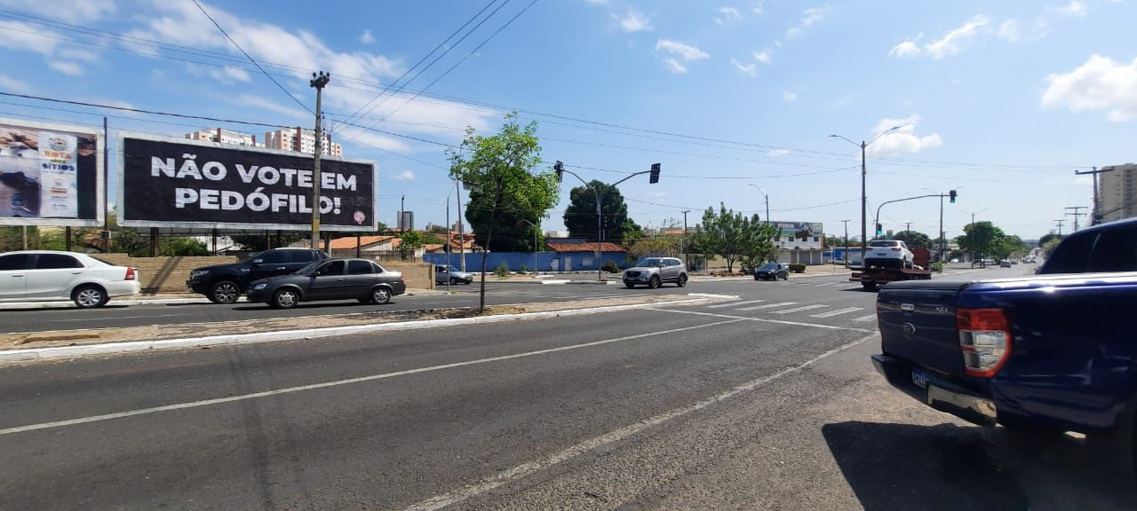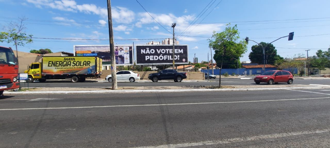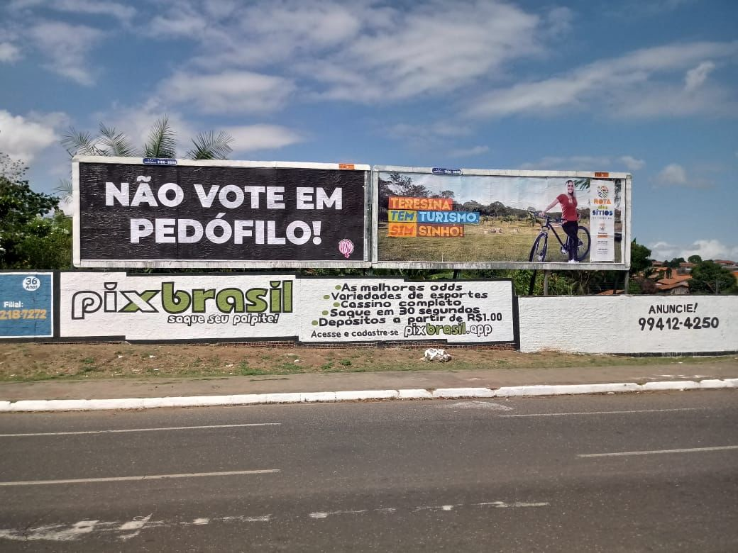 Outdoor's espalhados em vários cruzamentos das principais ruas e avenidas de Teresina orientam os eleitores a não votar em candidato pedófilo. Os cartazes, assinados pelo grupo União Brasileira de Mulheres (UBM), tem cores pretas com letras garrafais brancas, não dizem quem é o candidato, mas trata-se de uma alusão a Jair Bolsonaro, candidato do PL à reeleição.