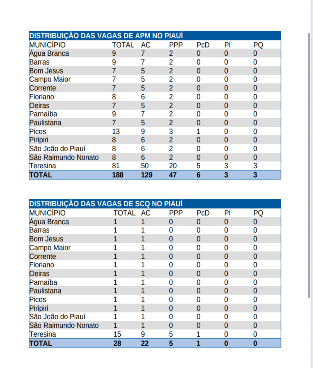 No Piauí, estão disponíveis 188 vagas para APM e 28 para SCQ, distribuídas em todas as agências do IBGE no estado. As oportunidades contemplam Ampla Concorrência e modalidades específicas, como para pessoas pretas e pardas, pessoas com deficiência, indígenas e quilombolas, conforme a disponibilidade de vagas em cada município.