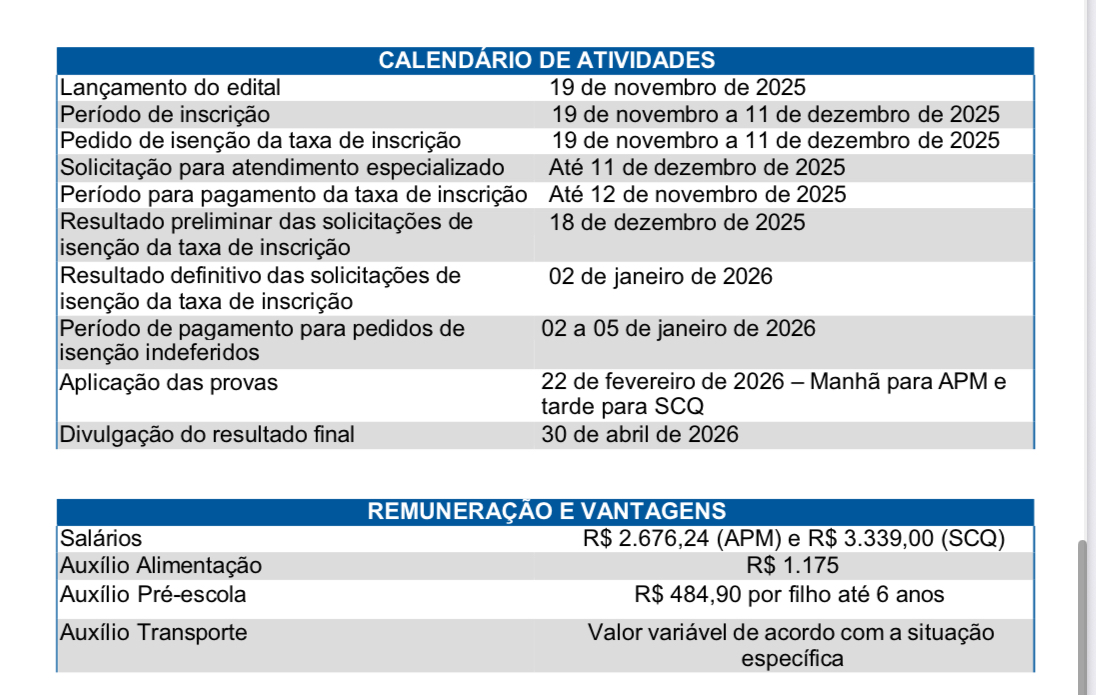 Também é possível se inscrever para os dois cargos, já que as provas serão aplicadas em horários diferentes no dia 22 de fevereiro de 2026.