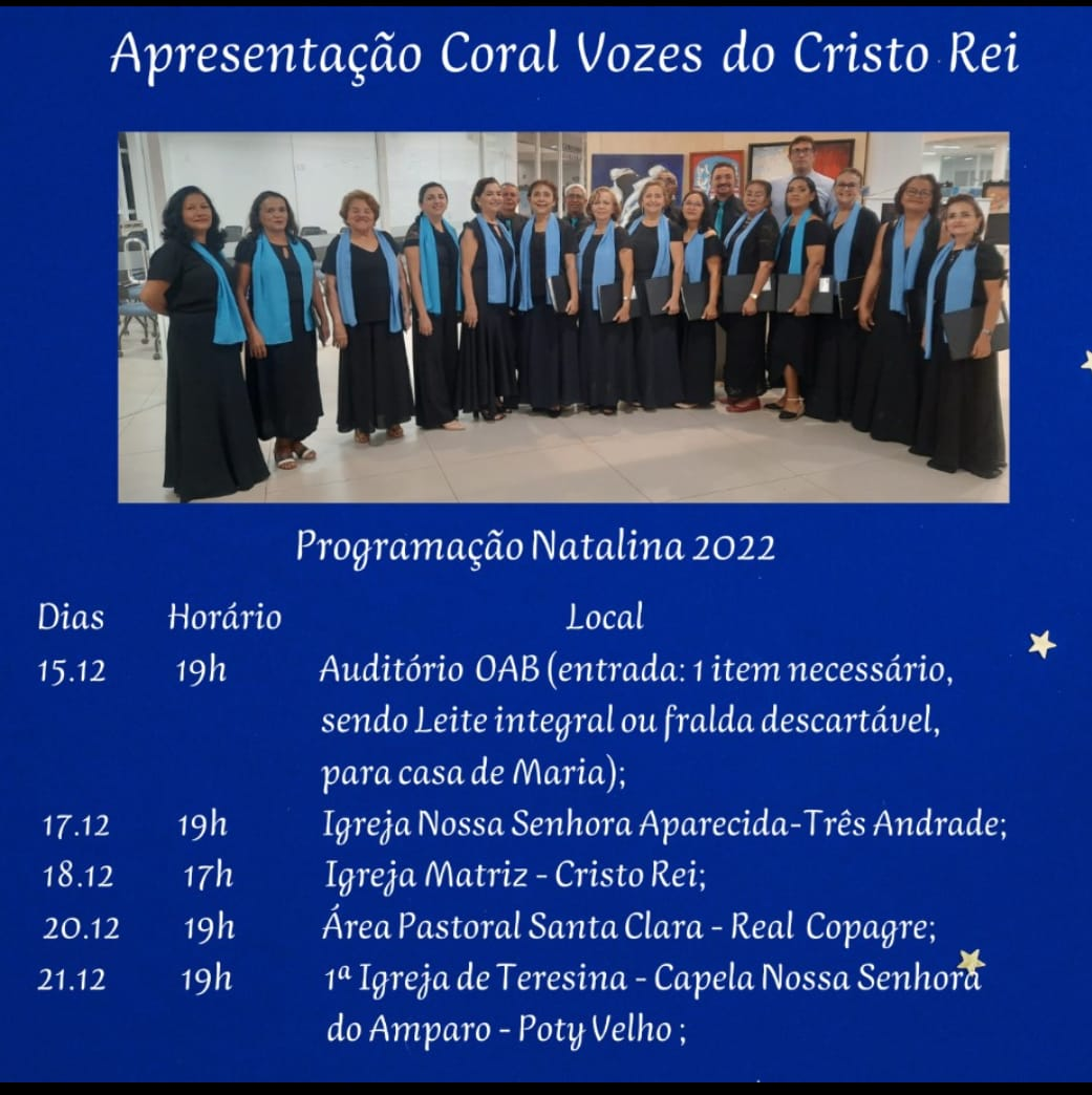 O Tenor Aislan Leal, o Coral Vozes do Cristo Rei em parceria com o Coral OAB Piauí e Trio performance's erudito, realizarão o 'Concerto de Natal para Teresina' nesta quinta-feira (15), no auditório da OAB, no bairro Cabral. O evento será beneficente e acontece de 19 às 20h.