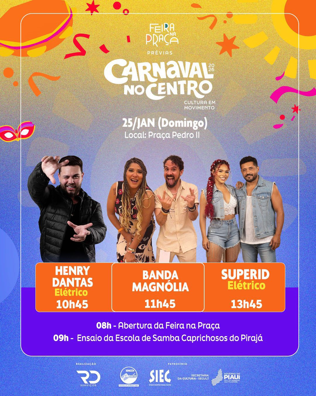 A ação conta com o apoio do Governo do Piauí, por meio da Secretaria de Estado da Cultura (Secult), e reforça a ocupação cultural do Centro da capital, valorizando artistas locais, a economia criativa e resgatando a identidade do Carnaval teresinense. Ao longo da manhã, o público também poderá acompanhar as apresentações de Henry Dantas Elétrico, Banda Magnólia e da Banda Superid Elétrico, levando diversidade musical, animação e muita energia para a praça.