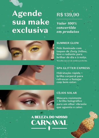 Para a ocasião, a marca aposta em caminhos criativos e personalizados, permitindo que cada pessoa adapte as tendências ao seu próprio estilo. Entre as sugestões de maquiagens está a “Carna Glow”, que entrega uma pele ultrarradiante e fresca com o combo de Sérum Hyaluronic e Bruma Facial Make B., garantindo viço, conforto e resistência ao calor. O visual é finalizado com o Iluminador Stick aplicado em pontos estratégicos do rosto.