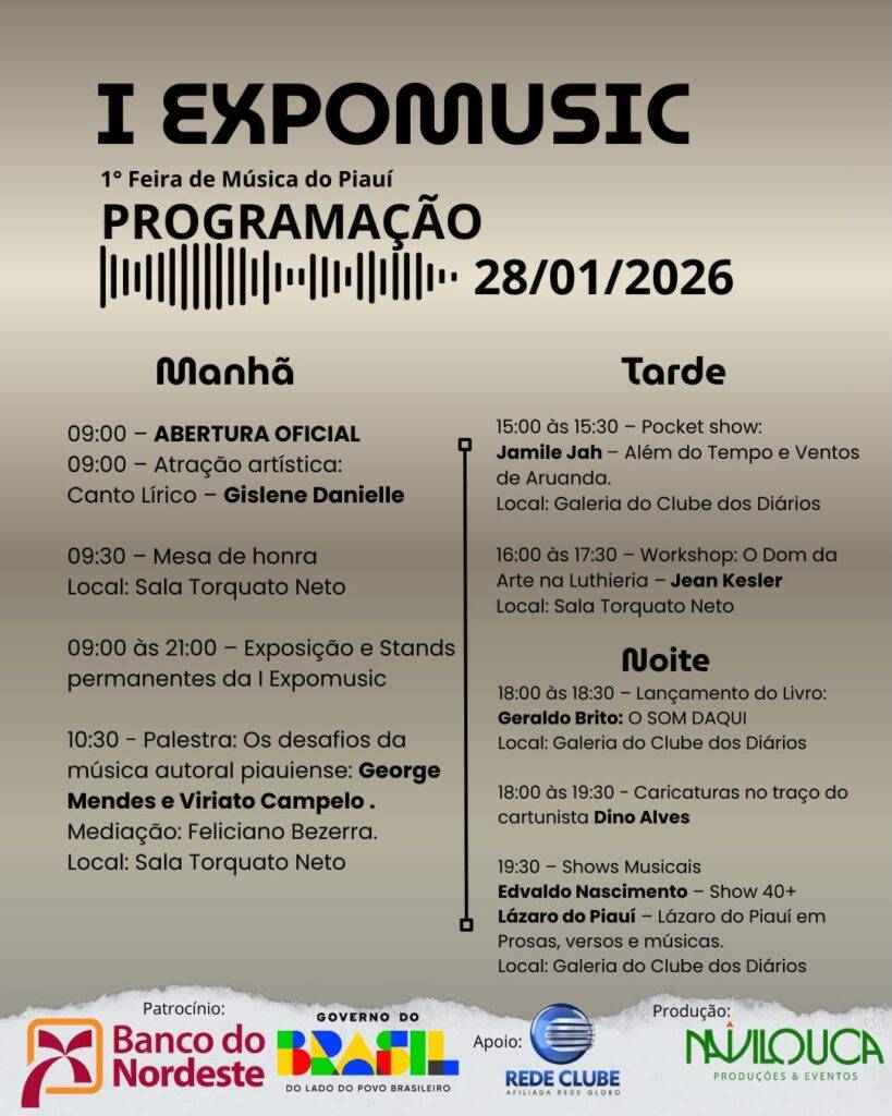 A I Expomusic (Feira de Música do Piauí) acontecerá em Teresina nos dias 28 e 29 de janeiro de 2026 no Complexo Cultural Clube dos Diários, com exposições de arte, stands, palestras sobre o mercado musical e shows de artistas locais como Edvaldo Nascimento, Lázaro do Piauí, Sarminina e Batuque Elétrico. Para mais informações, acesse: @navilouca_producoes.