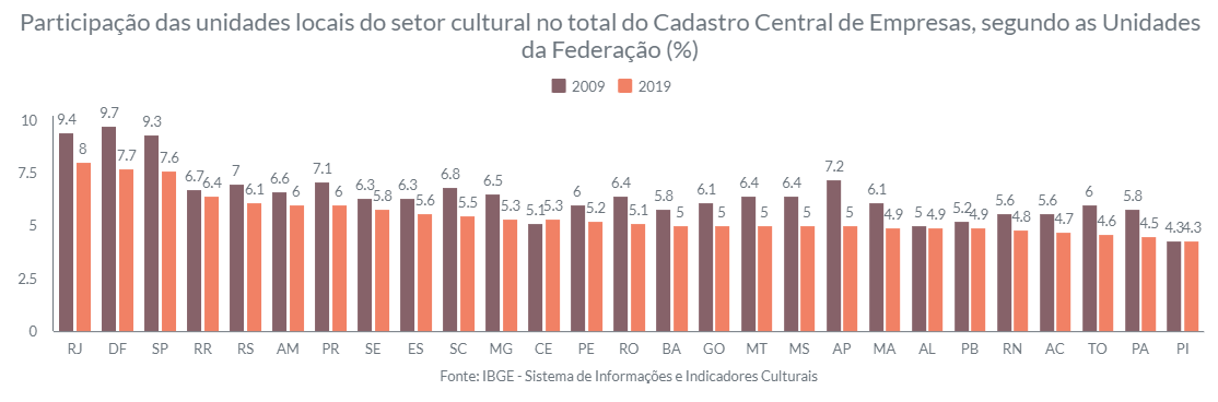 No Brasil, cerca de 6,3% das filiais eram da área cultural em 2019, proporção que era de 7,6% em 2009. O estado com maior concentração é o Rio de Janeiro, onde 8% do total das filiais ativas em 2019 atuavam no setor, índice que foi de 9,4% em 2009. Apenas outros três estados registraram proporções acima da média brasileira em 2019: Distrito Federal (7,7%), São Paulo (7,6%) e Roraima (6,4%). Somente o Ceará teve aumento de participação entre 2009 e 2019, passando de 5,1% a 5,3%.
