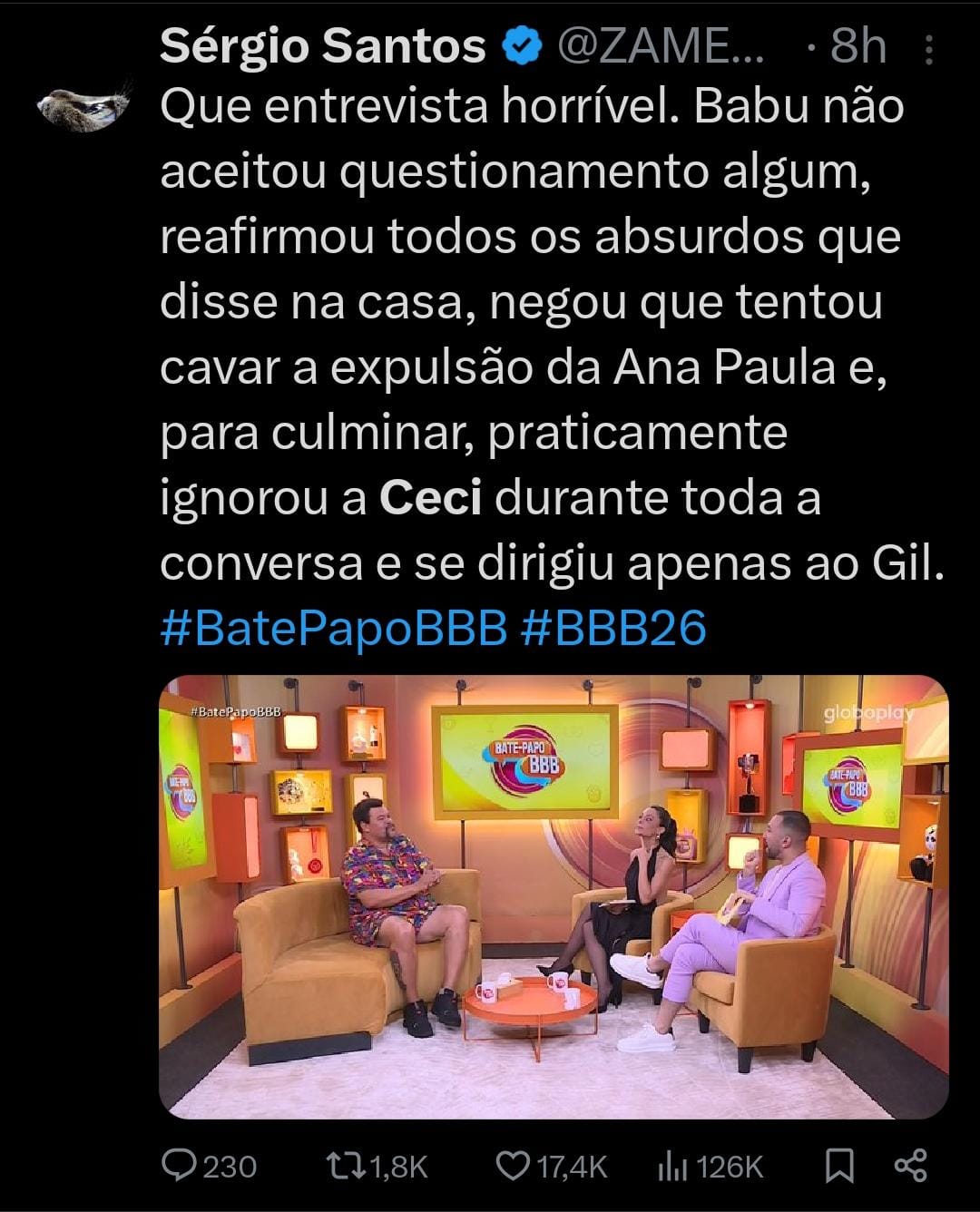 Nas redes sociais, vários comentários criticaram a postura do ator. “VERGONHOSO o Babu ignorando a Ceci e pra ele só existe o Gil, falta de respeito total”, escreveu uma pessoa. “Ele só olha pra mulher pra falar se transaria ou não com ela”, criticou mais um internauta.