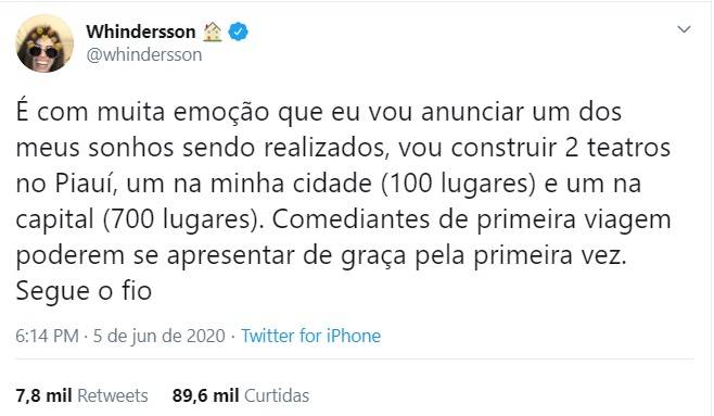 O Fábio Novo que se cuide, mas o youtuber Whindersson Nunes anunciou a construção de dois novos teatros no Piauí. A informação foi confirmada pelo humorista em seu perfil no Twitter nesta sexta-feira (05). Ele chegou a dizer que o projeto é "um dos meus sonhos sendo realizados".