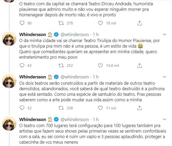 Segundo Whindersson, um teatro será construído em Teresina e terá 700 cadeiras, já o segundo espaço será erguido em "sua cidade". Whindersson nasceu em Palmeira do Piauí, mas cresceu e se criou em Bom Jesus, no Sul do Estado, nos tuítes não ficou claro qual das duas cidades vai receber a obra.