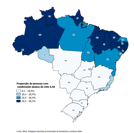 Aqueles em condição de pobreza no Brasil, que têm renda domiciliar per capita inferior a R$ 452,00 mensais, são aproximadamente 50,8 milhões de pessoas. Isso equivale a 24,1% da população brasileira, índice que é inferior ao constatado no Piauí (38,4%).