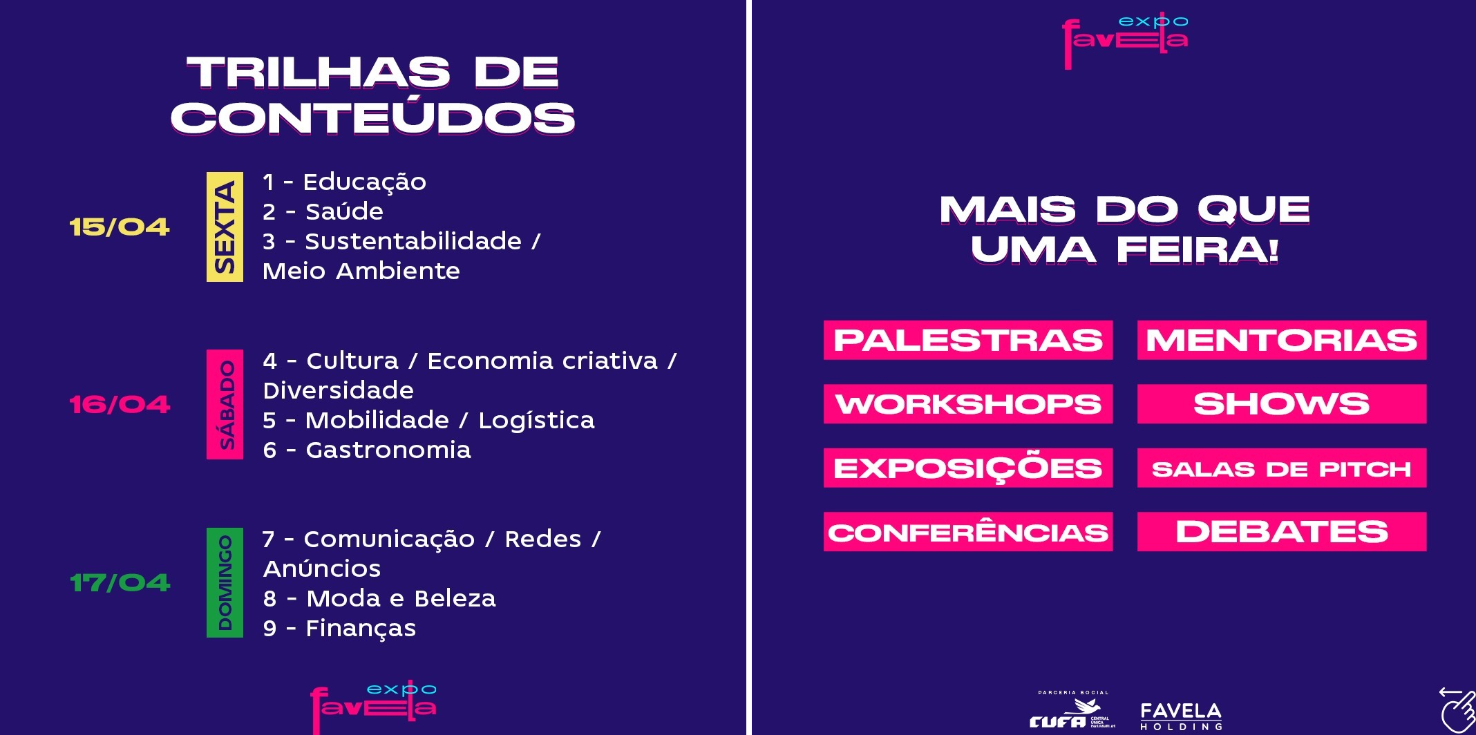 Nos dias 15, 16 e 17 de abril, a Expo Favela, evento que reúne empreendedores da favela e investidores do asfalto em uma área nobre de São Paulo, O evento é organizado por Celso Athayde, fundador da Central Única das Favelas (CUFA) e atual CEO da Favela Holding.