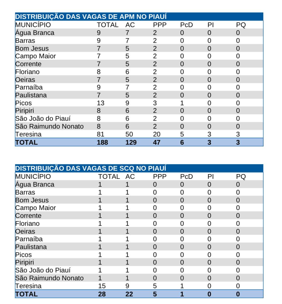 A maior parte das vagas é para APM, com 188 oportunidades em cidades como Teresina, Parnaíba, Picos, Piripiri, Floriano e São Raimundo Nonato. Para SCQ, são 28 vagas distribuídas entre os mesmos municípios. Em Teresina, está o maior número de postos: 81 para APM e 15 para SCQ.