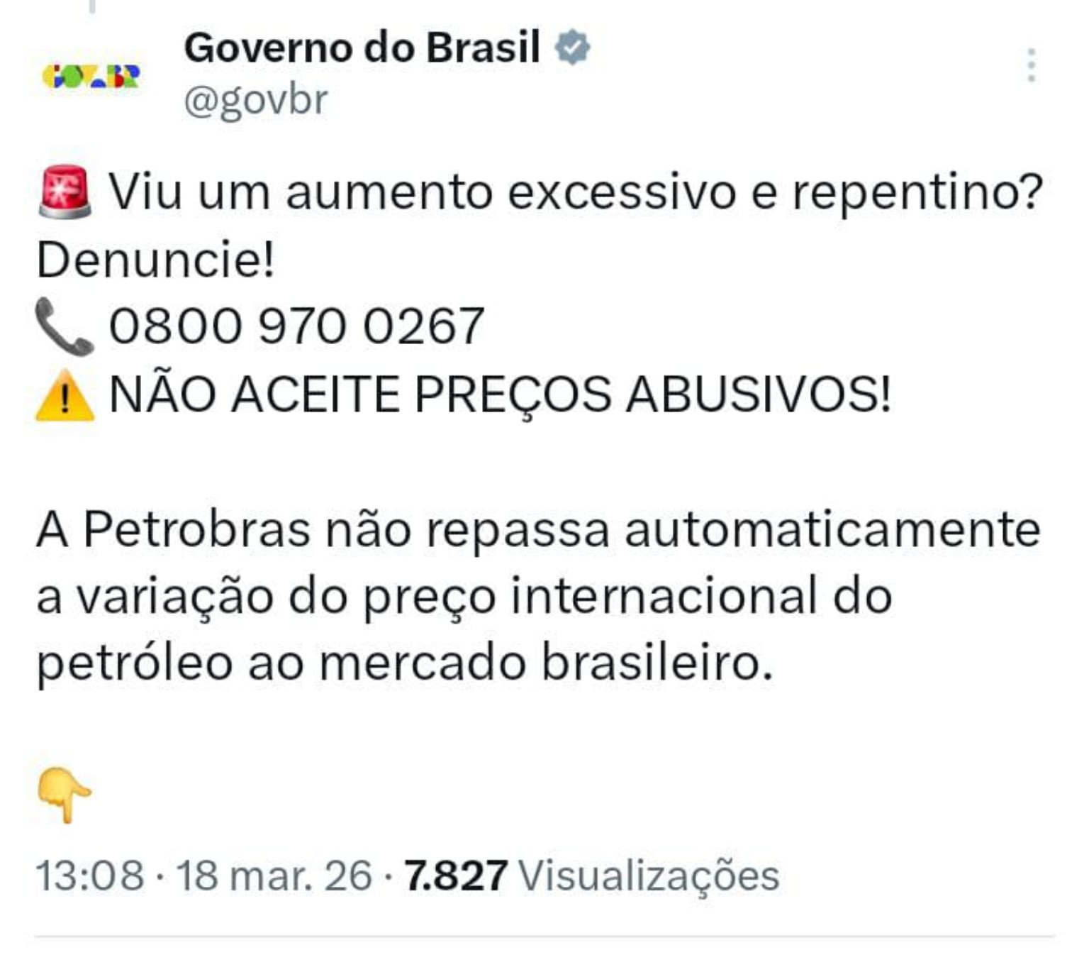 Também na quarta-feira (18), o Governo Federal publicou uma mensagem nas redes sociais orientando consumidores a denunciarem aumentos considerados abusivos. Na postagem, o perfil oficial informou: