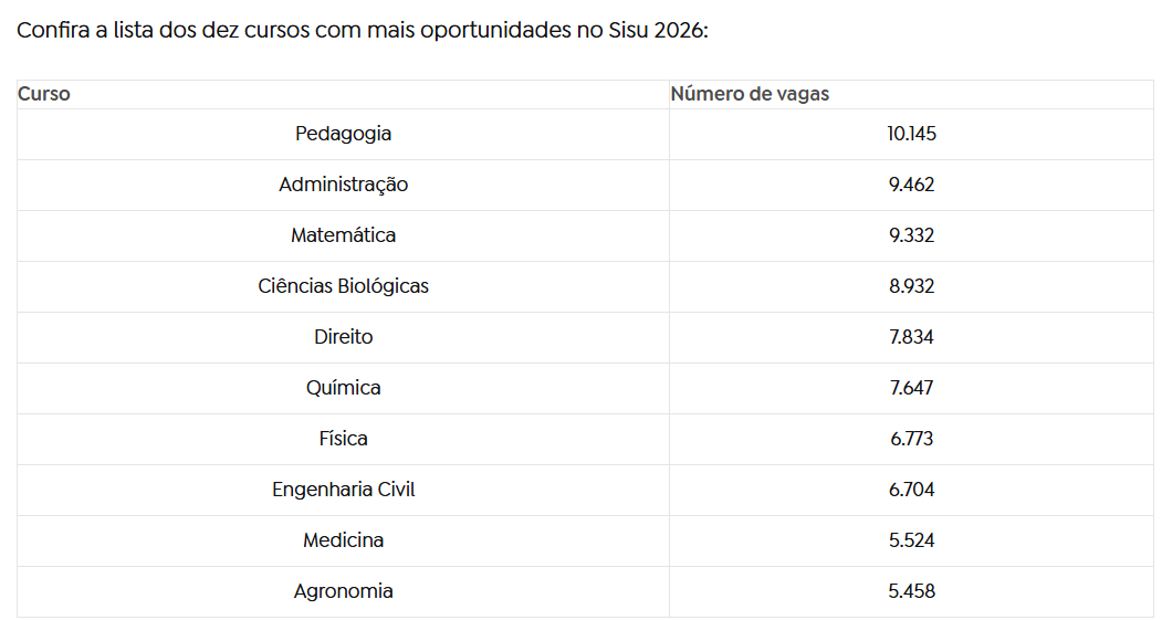 O Ministério da Educação (MEC) vai oferecer 274,8 mil vagas no processo seletivo de 2026 do Sistema de Seleção Unificada (Sisu). A edição é a maior da história do programa, com vagas para 7.388 cursos de 136 instituições participantes. A lista dos cursos com mais vagas é liderada por pedagogia, com 10.145 oportunidades. Em seguida, estão administração e matemática.