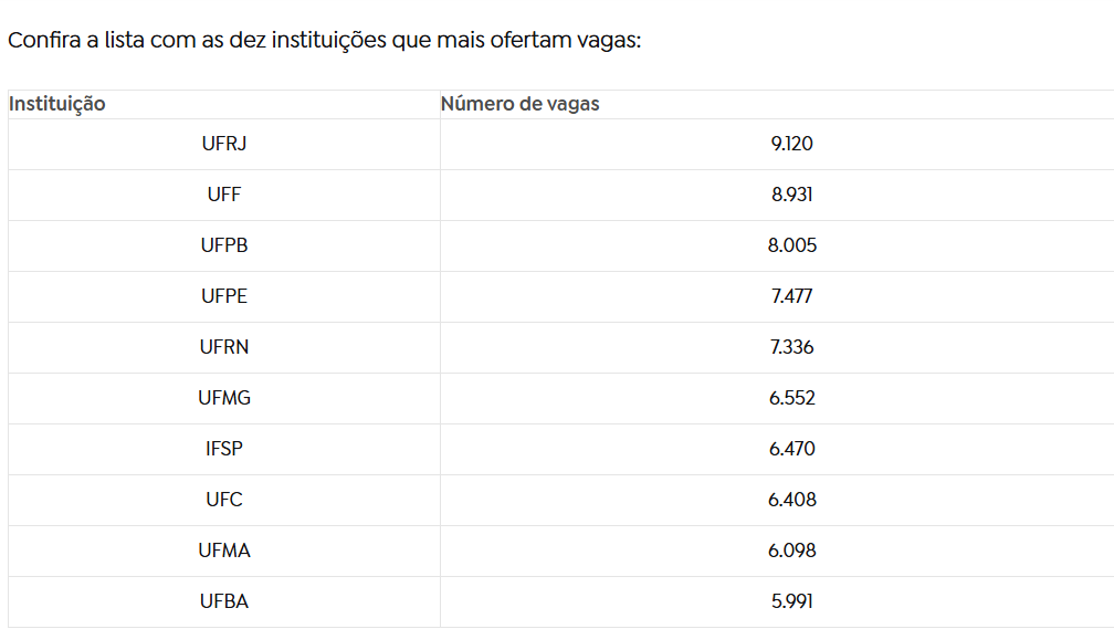 A instituição pública de educação superior com o maior número de vagas ofertadas no Sisu 2026 é a Universidade Federal do Rio de Janeiro (UFRJ), com 9.120 vagas. Em seguida, está a Universidade Federal Fluminense (UFF), com 8.931; a Universidade Federal da Paraíba (UFPB), com 8.005; e a Universidade Federal de Pernambuco (UFPE), com 7.477 vagas.