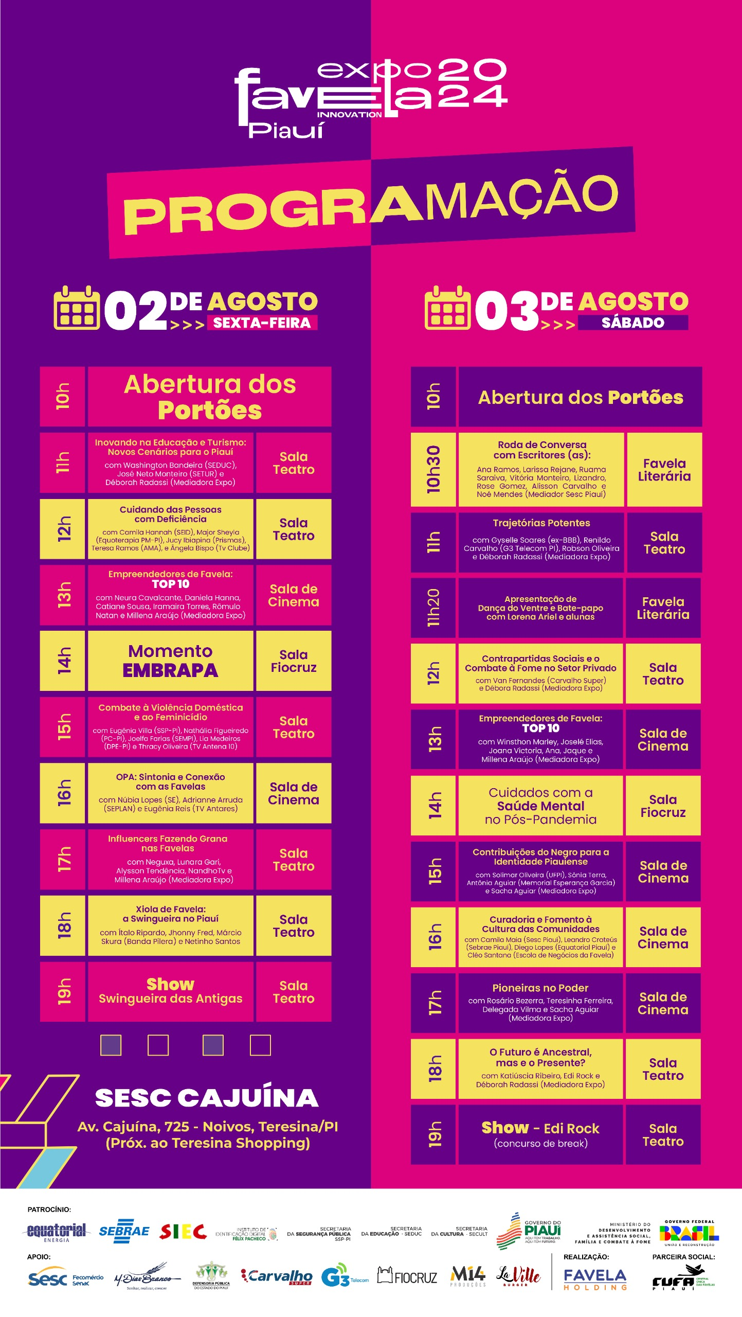 Além da feira, a programação da Expo Favela Innovation Piauí 2024 conta com palestras, workshops, exposições, rodadas de negócios, mentorias, debates, cursos, shows, filmes, desfiles e outras iniciativas criadas por empreendedores das comunidades da capital e do interior do estado. Toda programação é gratuita e aberta ao público. O evento tem o patrocínio da Equatorial Piauí por meio do Sistema Estadual de Incentivo à Cultura (SIEC).