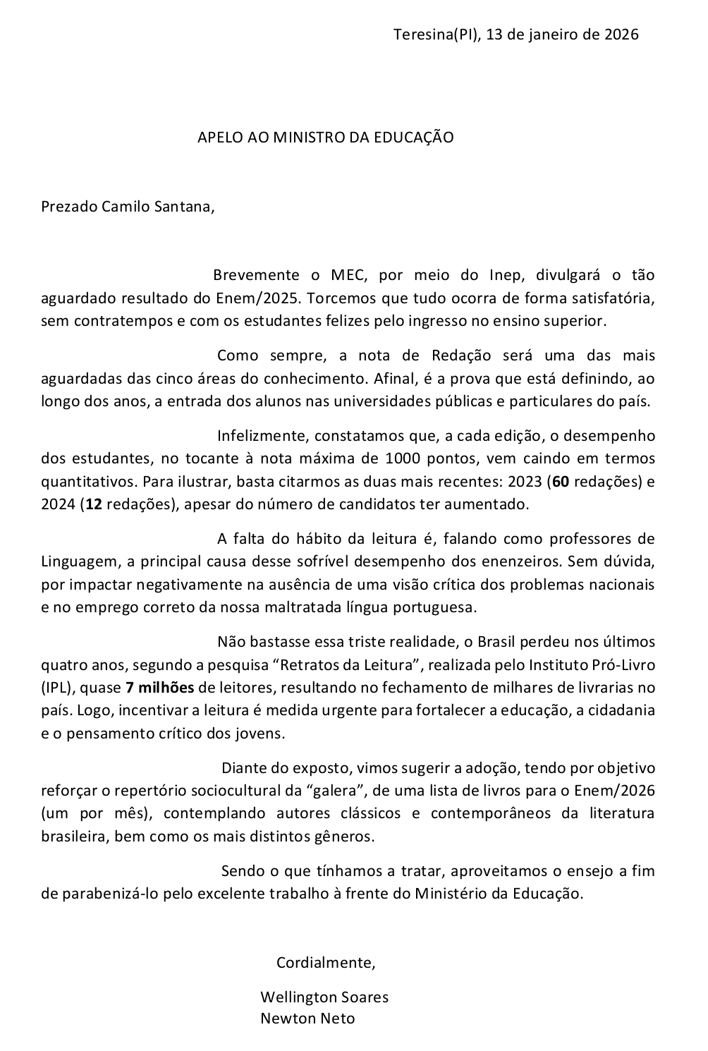 Para Wellington Soares e Newton Neto, a “falta do hábito da leitura” é a principal causa do “sofrível desempenho dos enenzeiros”. Eles argumentam que isso impacta negativamente tanto na capacidade de análise crítica sobre problemas nacionais quanto no domínio da língua portuguesa. A carta também menciona dados da pesquisa “Retratos da Leitura”, do Instituto Pró-Livro (IPL), que indica que o Brasil perdeu quase 7 milhões de leitores nos últimos quatro anos, com o fechamento de milhares de livrarias.