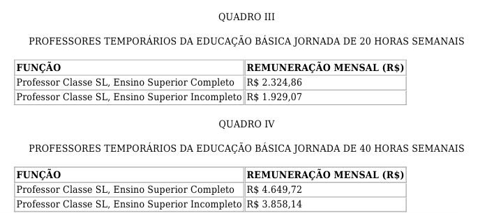 De acordo com o novo texto, foram reajustados os valores de remuneração para docentes da educação básica contratados em regime temporário, com jornadas de 20 e 40 horas semanais.