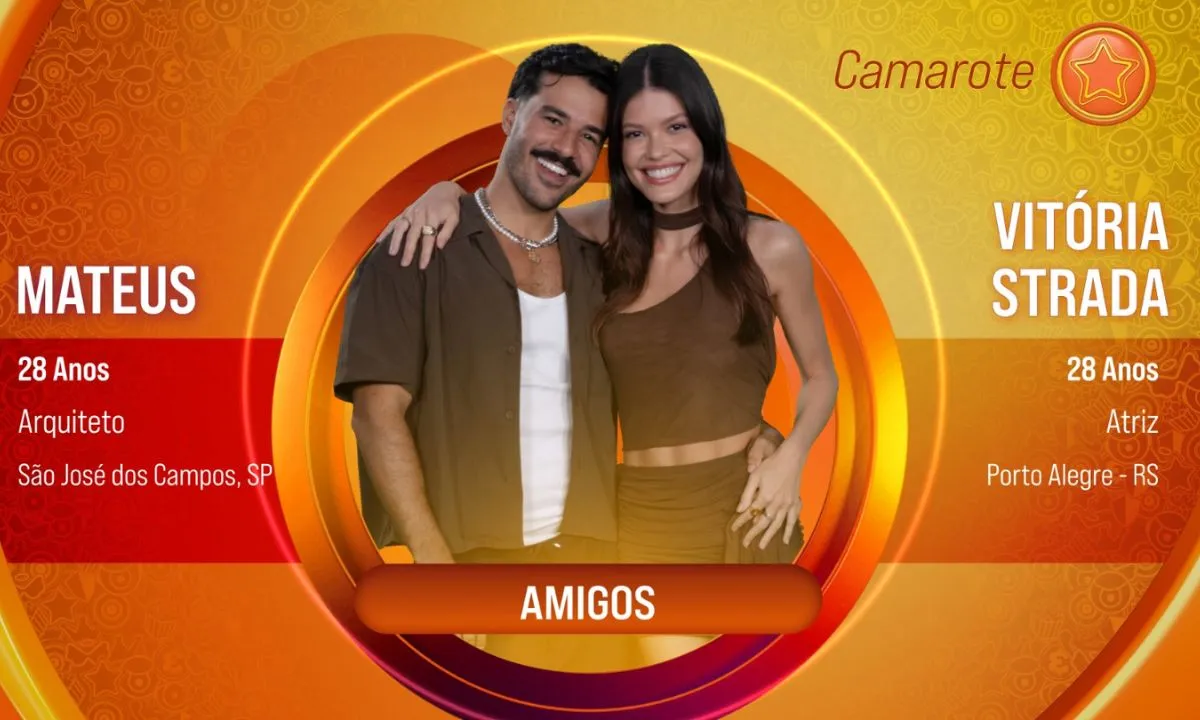 A atriz Vitória Strada, de 28 anos, e o arquiteto Mateus Pires, também de 28 anos, são amigos inseparáveis, com uma conexão tão forte que costumam brincar dizendo que parecem um casal. Vitória é natural de Porto Alegre (RS), enquanto Mateus é de São José dos Campos (SP), mas se mudou para o Rio de Janeiro ainda criança. A amizade deles se consolidou quando Vitória se mudou para a capital carioca para atuar em novelas.