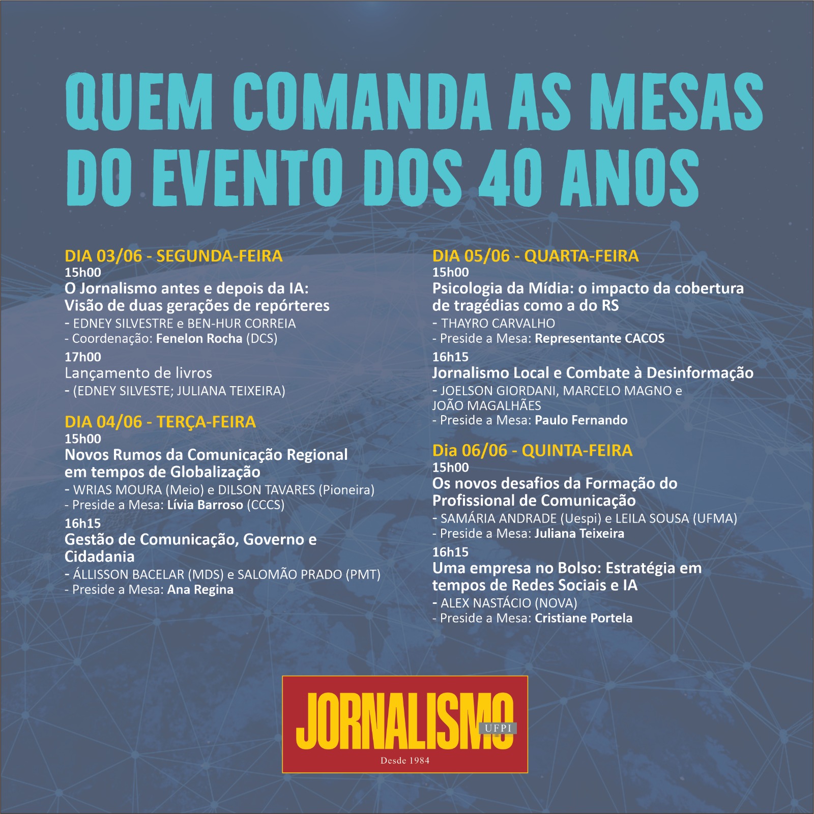 O curso de Jornalismo da Universidade Federal do Piauí (UFPI) completa 40 anos de história. Para celebrar a data, o Departamento de Comunicação Social organizou um evento especial que será realizado entre os dias 3 a 6 de junho, no auditório Maria Salomé Cabral, no Centro de Ciências da Educação (CCE), no Campus Petrônio Portela, em Teresina. A programação inclui palestras, mesas redondas, oficinas e momentos de confraternização, reunindo ex-alunos, professores, estudantes e profissionais da área de comunicação.