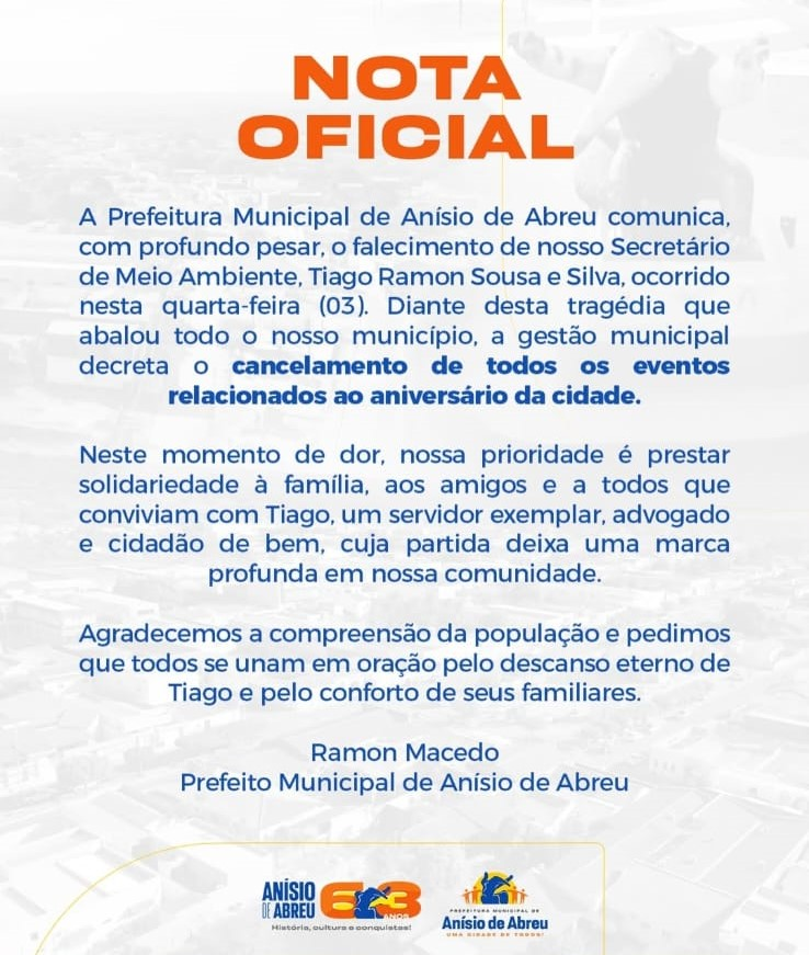 A prefeitura do município cancelou todas as festividades marcadas para o aniversário da cidade, previsto para sexta-feira (5), em respeito à memória do secretário. Em nota, a prefeitura destacou que Tiago foi um servidor exemplar e cidadão de bem, cuja partida deixa uma marca profunda em nossa comunidade.