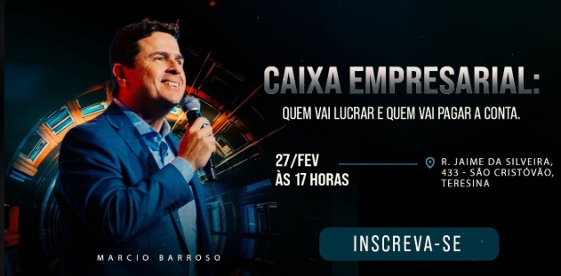 Empresários de Teresina podem participar, no dia 27 de fevereiro de 2026, do evento “Caixa Empresarial: quem vai lucrar e quem vai pagar a conta”, que contará com palestra de Marcio Barroso. O encontro será realizado às 17h, no Gran Hotel Arrey, localizado na Rua Jaime da Silveira, 433, bairro São Cristóvão.