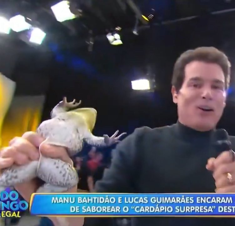 A situação aconteceu durante o quadro “Cardápio Surpresa”, quando uma rã foi levada ao palco como parte da brincadeira. O que era para ser um momento descontraído acabou saindo do controle após o animal escapar, provocando correria entre os convidados, como Lucas Guimarães, e a produção.