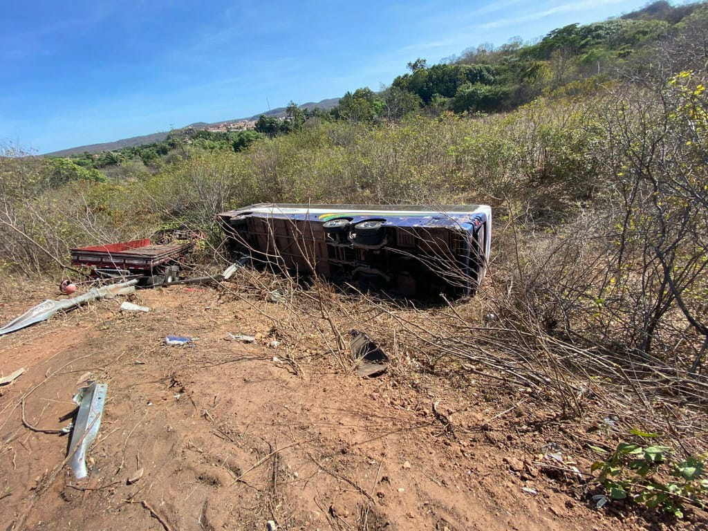 De acordo com a Polícia Rodoviária Federal (PRF), há indícios de que os freios do caminhão falharam e isso provocou a colisão lateral com o ônibus. Com o impacto, o ônibus tombou e o caminhão desceu a ribanceira.