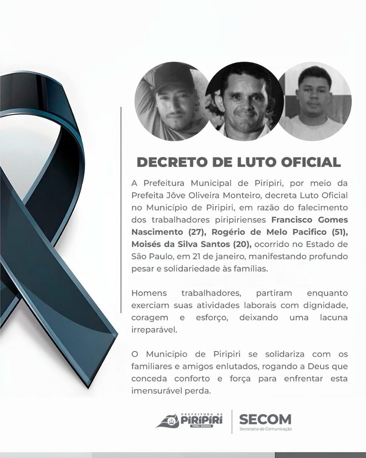 Diante da comoção causada pela morte dos trabalhadores, a Prefeitura de Piripiri decretou luto oficial no município em homenagem às vítimas. Em nota, a gestão municipal manifestou profundo pesar, destacou a trajetória de trabalho e dedicação dos homens e se solidarizou com os familiares e amigos neste momento de dor.