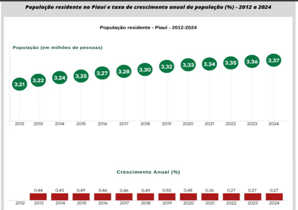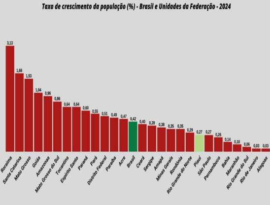 Segundo o levantamento, o Piauí registrou uma queda de 0,28 ponto percentual na taxa de crescimento populacional entre 2019 e 2024. Foi a 6ª maior queda do país, ficando atrás apenas de estados como Roraima, Amazonas e Maranhão.
