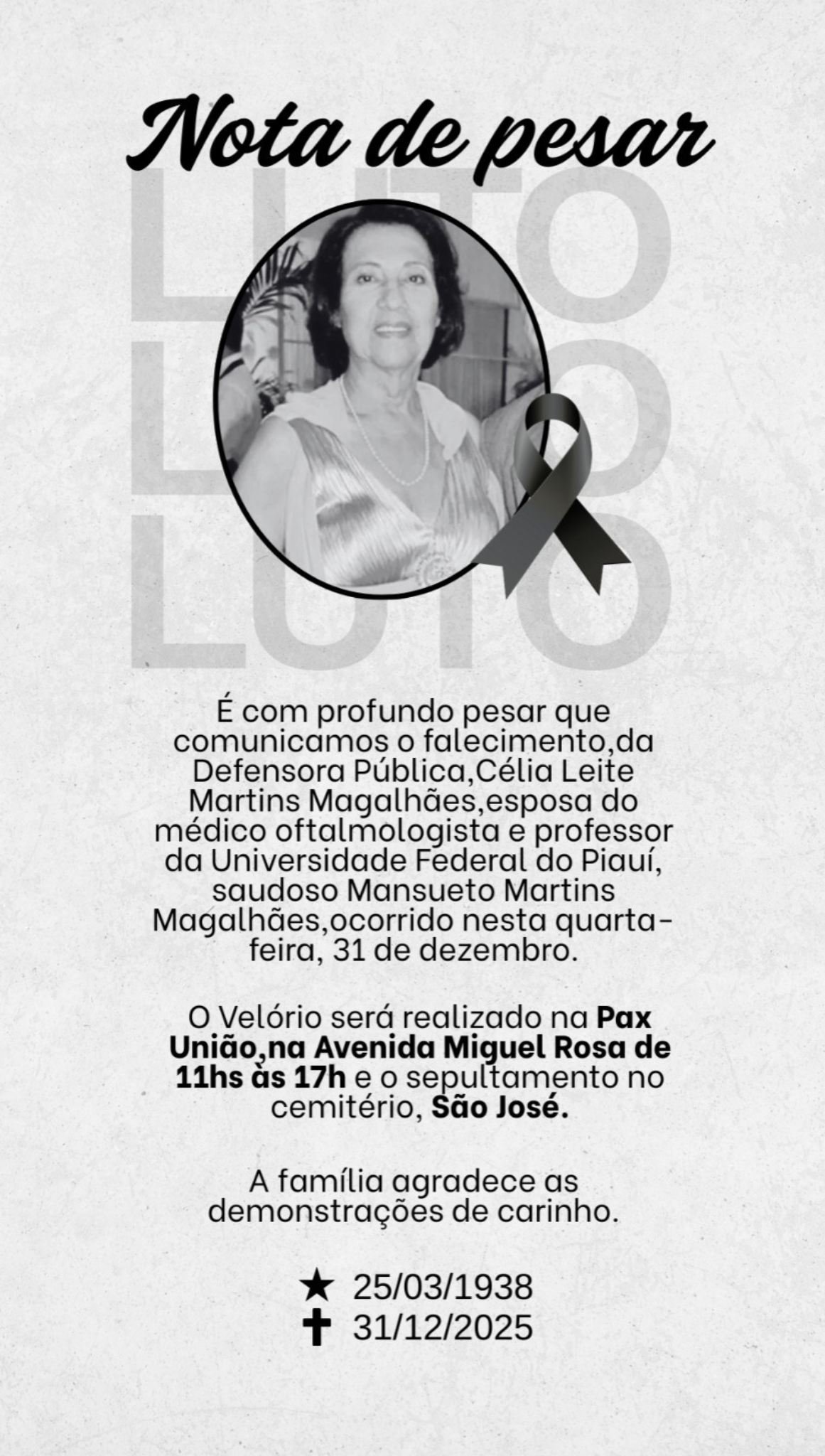 Célia Leite teve uma trajetória marcada pela atuação na Defensoria Pública e era reconhecida pelo compromisso com a justiça e a defesa dos direitos da população. Ela era esposa do médico oftalmologista e professor da Universidade Federal do Piauí (UFPI), Mansueto Martins Magalhães, que faleceu vítima da Covid-19 em 2020.