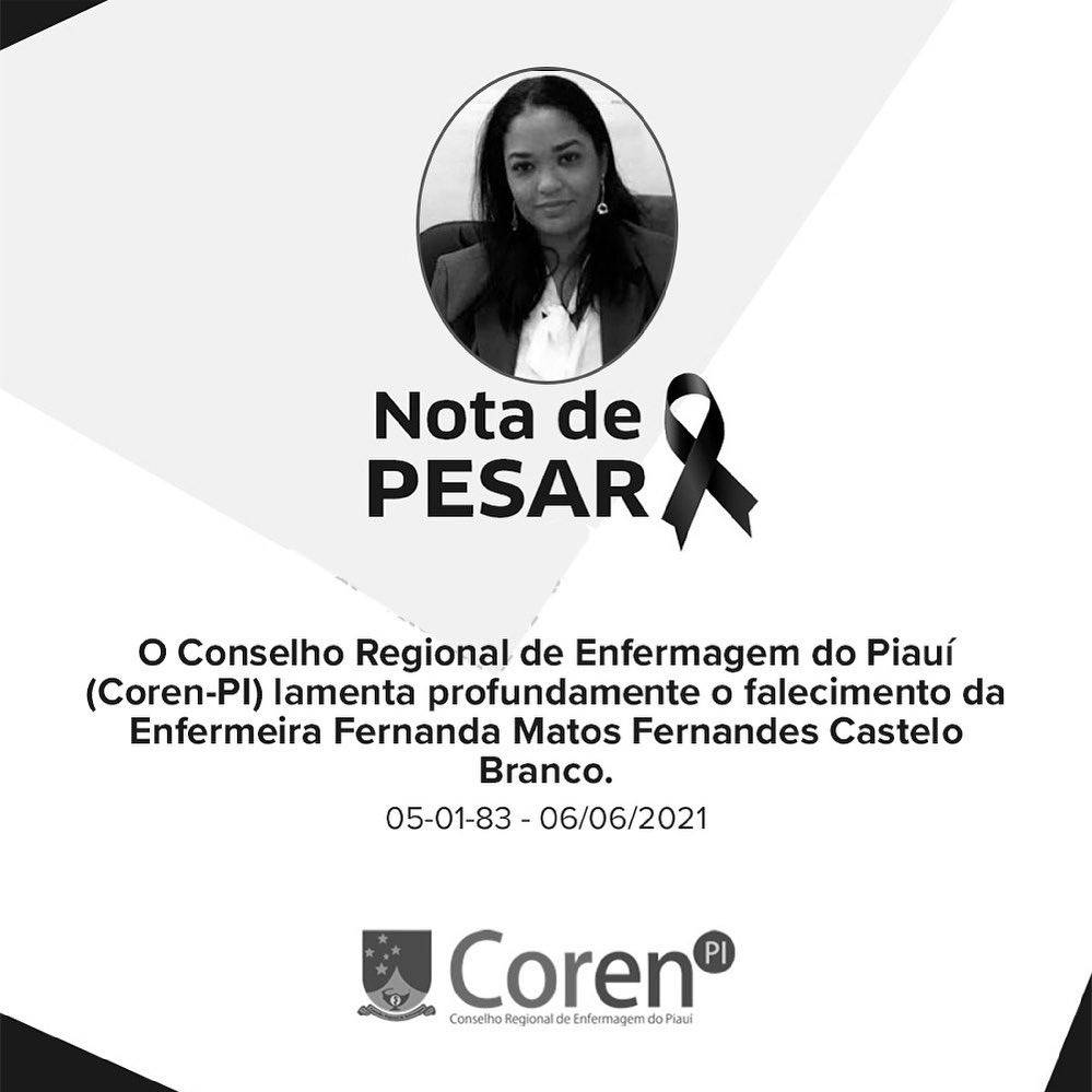 "Com profundo pesar, que informamos o falecimento da Enfermeira Fernanda Matos Fernandes Castelo Branco, de 38 anos. Fernanda Matos se formou no Centro Universitário Uninovafapi, lecionou por muito tempo na Uninovafapi, mas atualmente estava sendo professora na Universidade Federal do Amapá - Campus Oiapoque. Neste momento de dor, desejamos forças aos seus amigos e familiares. O Coren-PI agradece a dedicação e contribuição da profissional para o desenvolvimento da enfermagem no Piauí".