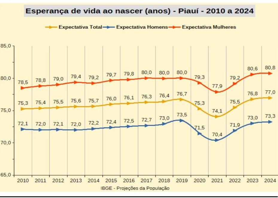 A análise por gênero mostra que as mulheres piauienses têm expectativa de 80,8 anos em 2024, um aumento de 2,9% frente aos 78,5 anos de 2010. Já os homens atingiram 73,3 anos, crescimento de 1,7% em comparação com os 72,1 anos de 2010. A diferença entre gêneros se mantém em 7,5 anos.