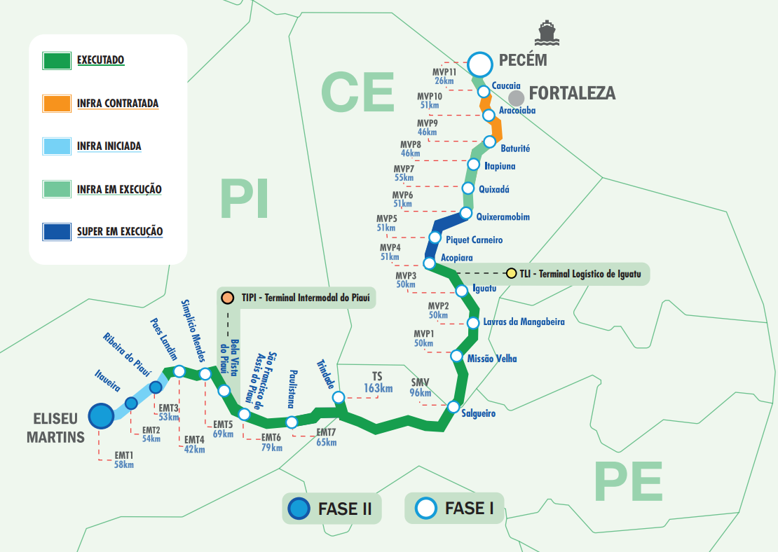 Para fortalecer a integração logística, a TLSA também planeja a implantação de seis a oito terminais ao longo da ferrovia. Entre os pontos estratégicos previstos estão Eliseu Martins e Bela Vista do Piauí, no Piauí; Trindade e Salgueiro, em Pernambuco; além de Missão Velha, Maranguape e o Porto do Pecém, no Ceará. A malha contará ainda com terminais de parceiros privados, como os localizados em Quixeramobim e Iguatu, no Ceará.